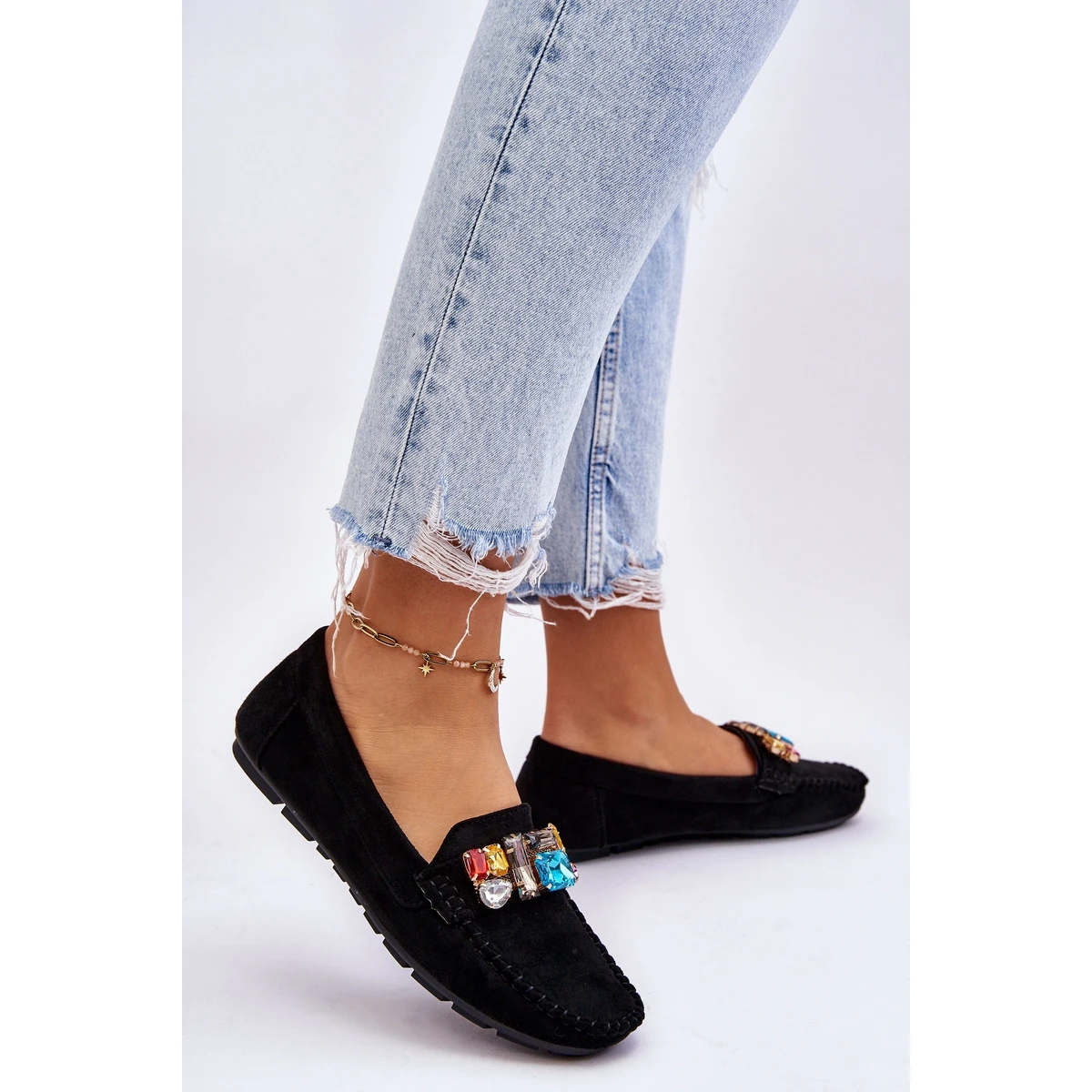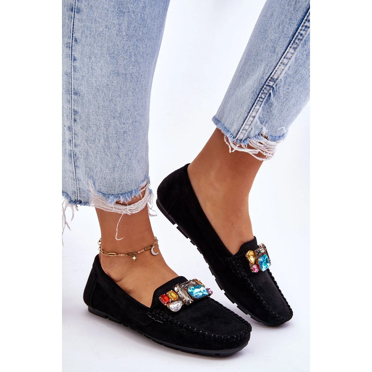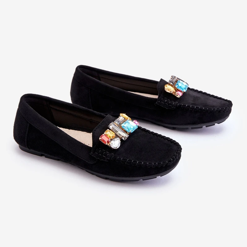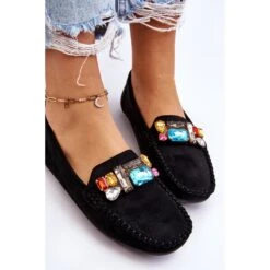 Classiques, les mocassins pour femmes sont fabriqués en daim écologique. Sur le devant, il y a des cristaux décoratifs colorés. Les mocassins ont été montés sur une semelle au profil délicat. La semelle intérieure souple est en outre perforée et en cuir naturel. Un excellent modèle pour de nombreuses stylisations printemps-été ! Lorsque vous choisissez une taille, veuillez utiliser le tableau des tailles.