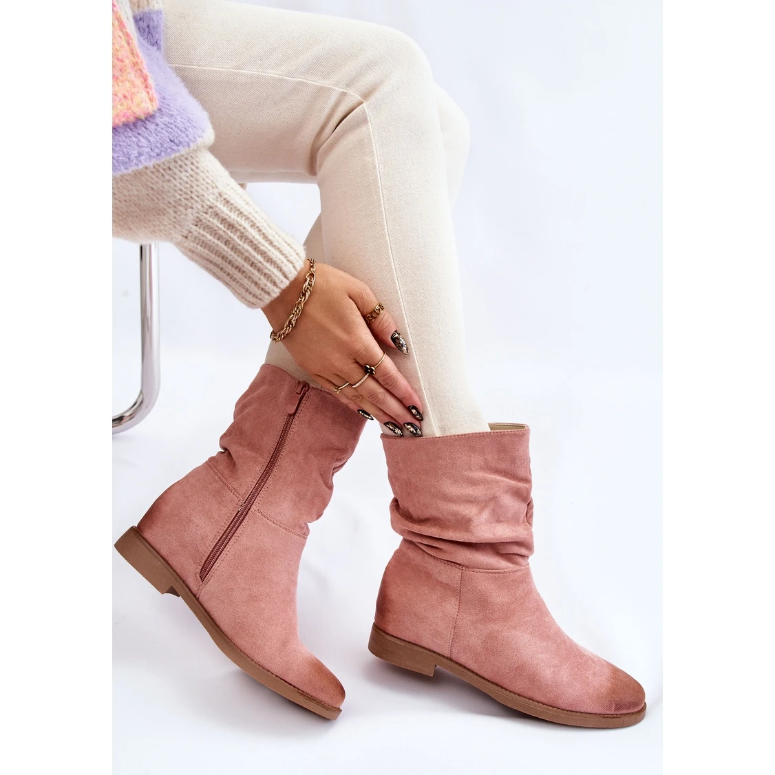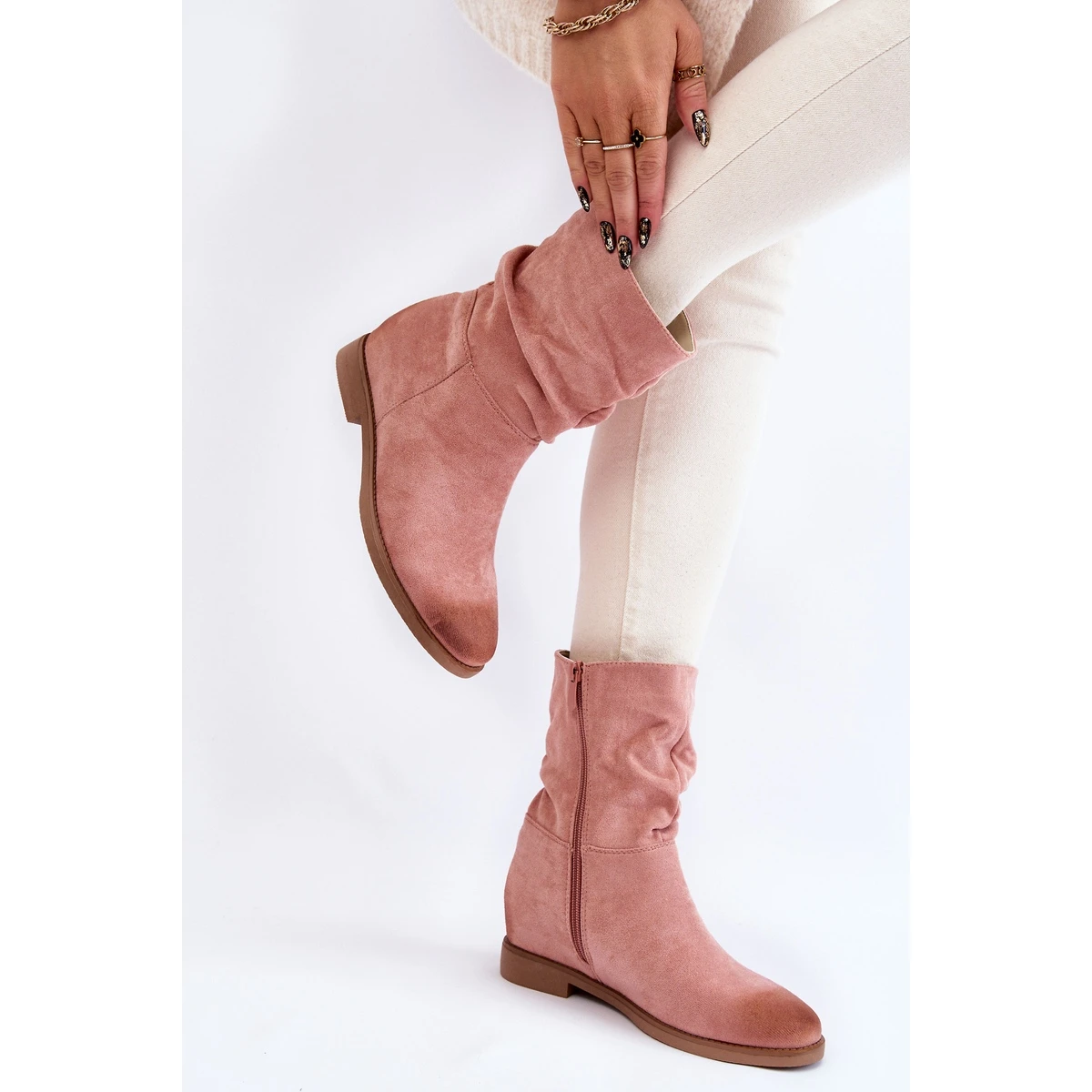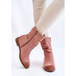 Les bottes pour femmes ont une tige haute légèrement volantée au-dessus de la cheville. Fermé par une fermeture éclair. Fabriqué en daim écologique agréable au toucher. La semelle intérieure est en tissu. Talon raidi. Il y a des abrasions à la mode sur le nez et l’arrière de la tige. Parfait pour le printemps et l’automne. Ce modèle ira très bien avec un jean ou une jupe aérienne. Lorsque vous choisissez une taille, veuillez utiliser le tableau des tailles.