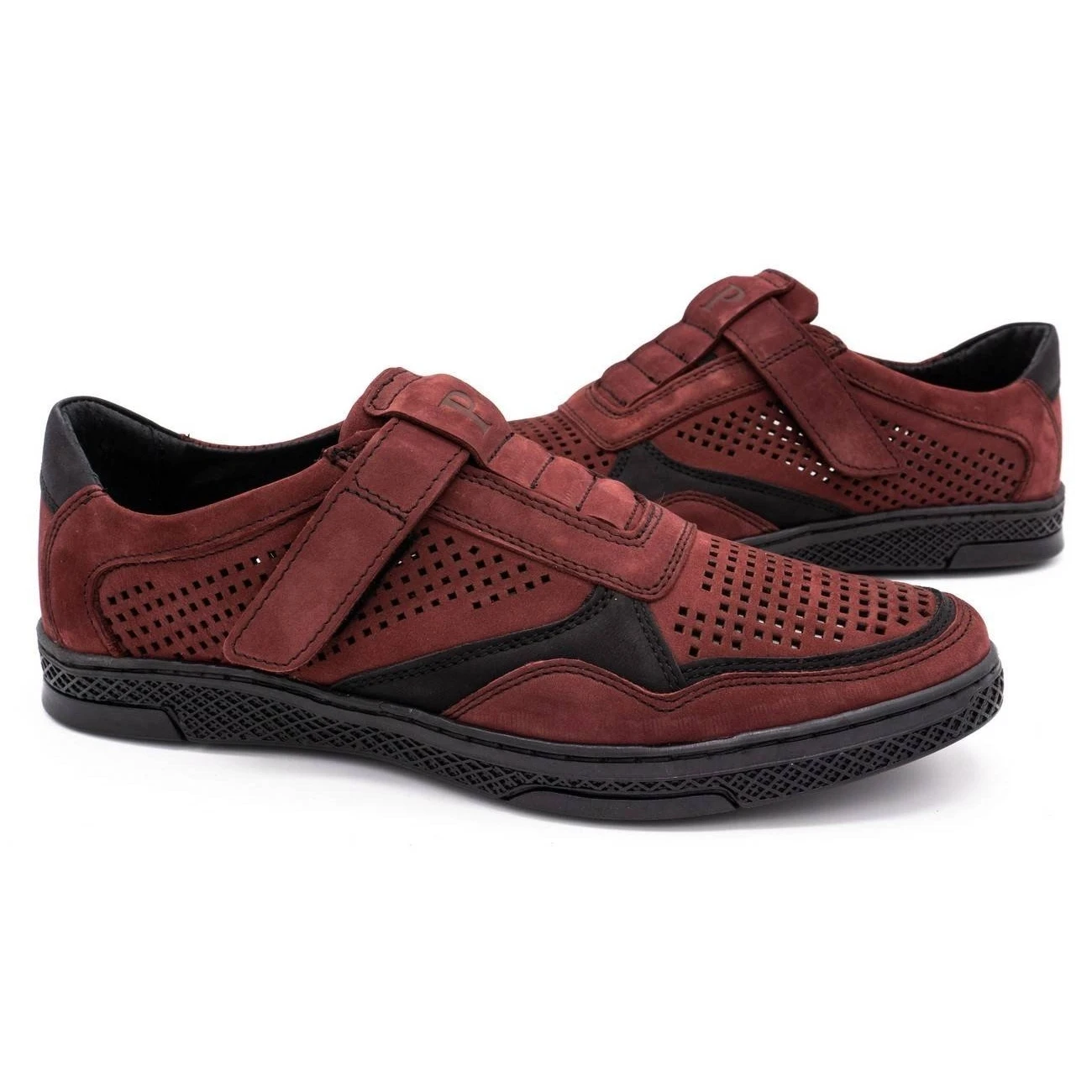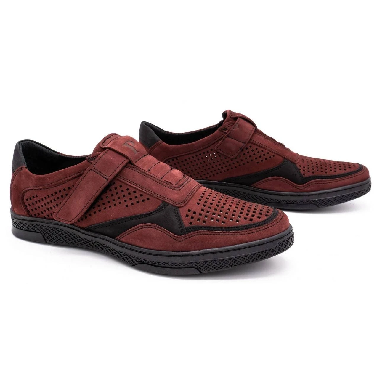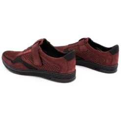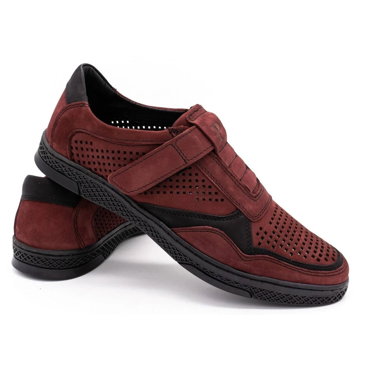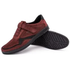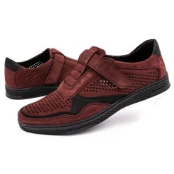 Chaussures casual homme bordeaux. Les chaussures d’été ont une surface en cuir recouverte d’une décoration ajourée, grâce à laquelle le pied peut respirer librement. Il y a un insert en plastique noir au-dessus du contrefort de talon intégré, près des orteils et sur les orteils ronds. Il y a une large bande Velcro en haut.