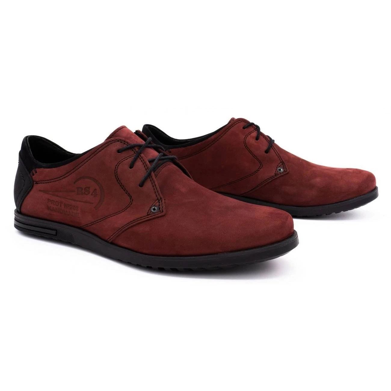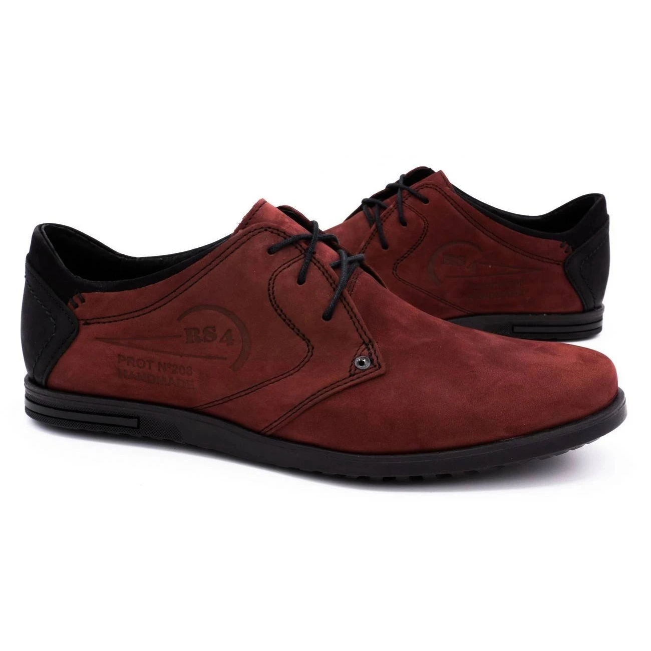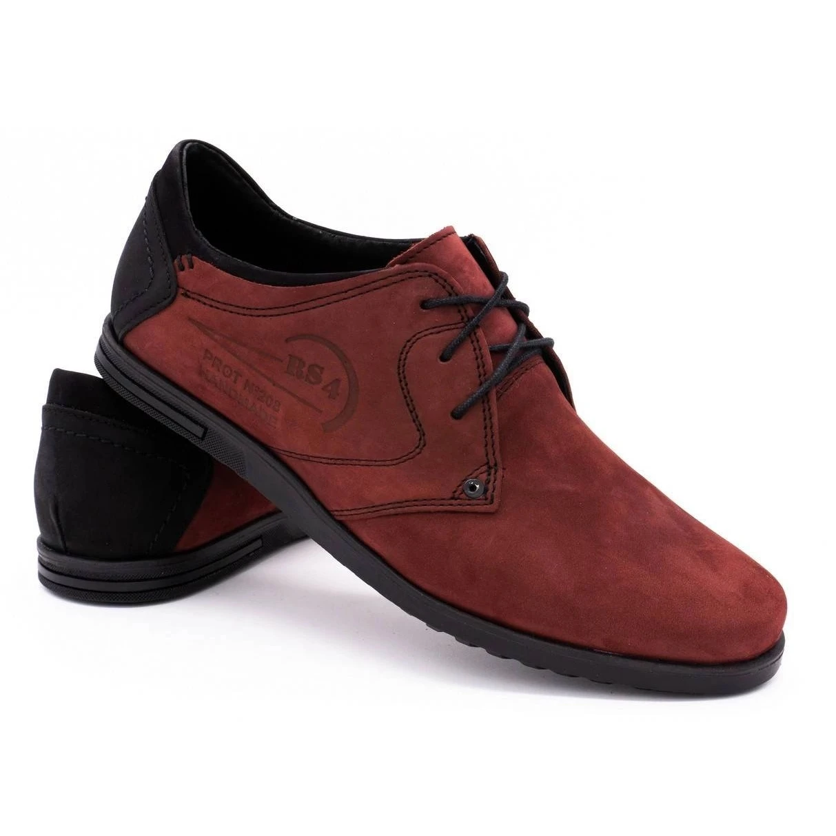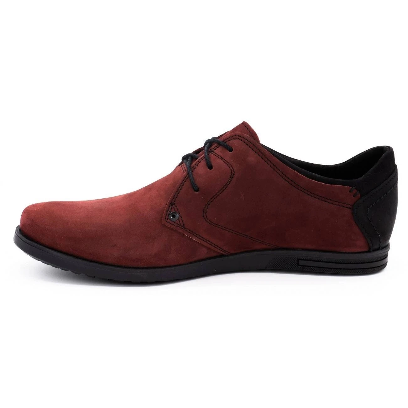 Chaussures pour hommes avec une coupe classique. Les chaussures ont des bouts arrondis et de fins lacets noirs à l’arrière. La tige est en cuir naturel rouge-marron foncé. Le contrefort de talon intégré et rigidifié est renforcé par une couche de plastique noir. La plate-forme basse a une semelle synthétique avec un motif de bande de roulement.