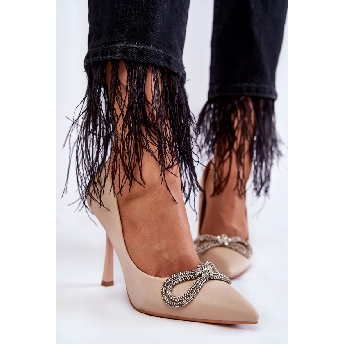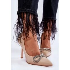 Les talons hauts élégants sont en matière textile. Sur le devant, il y a un arc décoratif avec des jets étincelants. Un bout pointu et un talon effilé vers le haut en forme d’épingle affineront vos jambes. Une semelle intérieure en cuir écologique doux assurera le confort lors de l’utilisation. Ce modèle ajoutera du charme à vos stylisations ! Lorsque vous choisissez une taille, veuillez utiliser le tableau des tailles.