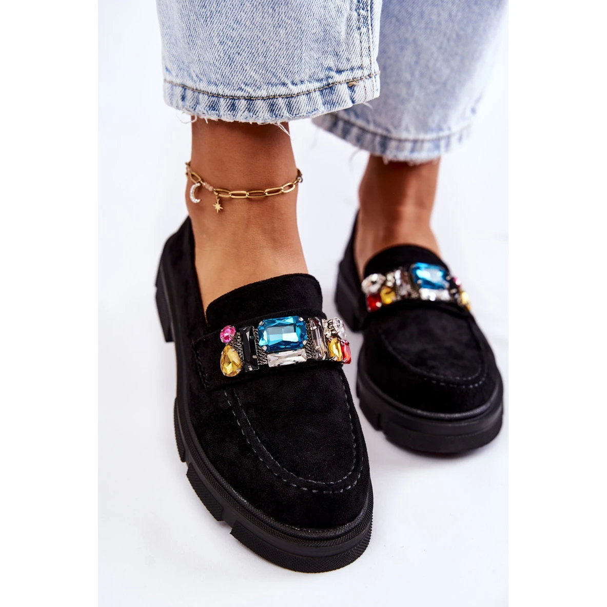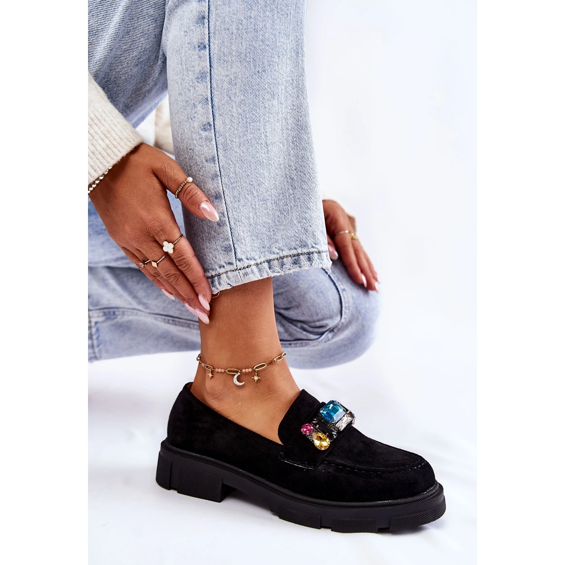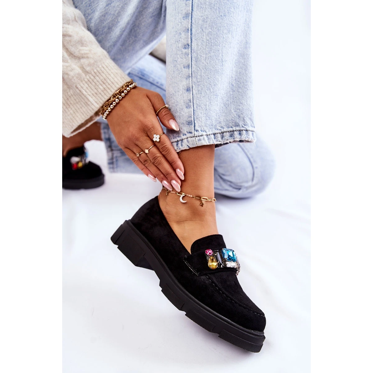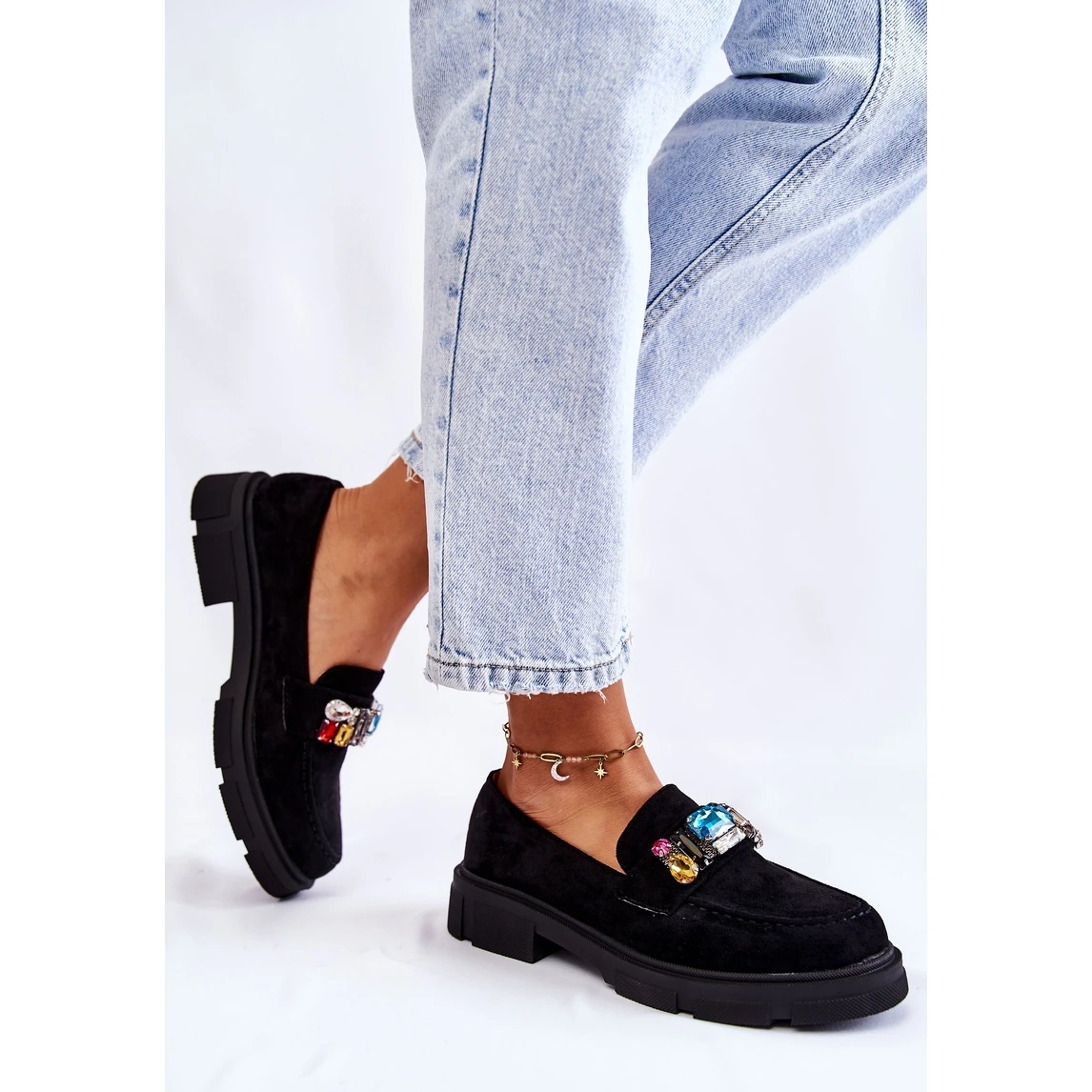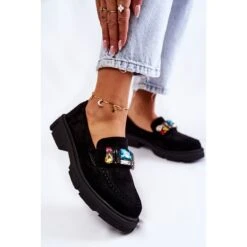 Les chaussures classiques sont fabriquées en cuir suédé écologique agréable au toucher. Sur le devant, il y a un ornement caractéristique sous forme de cristaux et de strass. Les chaussures ont une plateforme et un talon plat. La semelle à rainures isole parfaitement du sol et est en plus antidérapante. La semelle intérieure en cuir naturel vous assurera un confort d’utilisation. Le modèle parfait pour de nombreux styles ! Lorsque vous choisissez une taille, veuillez utiliser le tableau des tailles.
