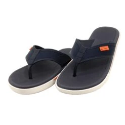 Les tongs sont bleu marine. Il a le logo de la marque, qui se trouve sur la sangle.