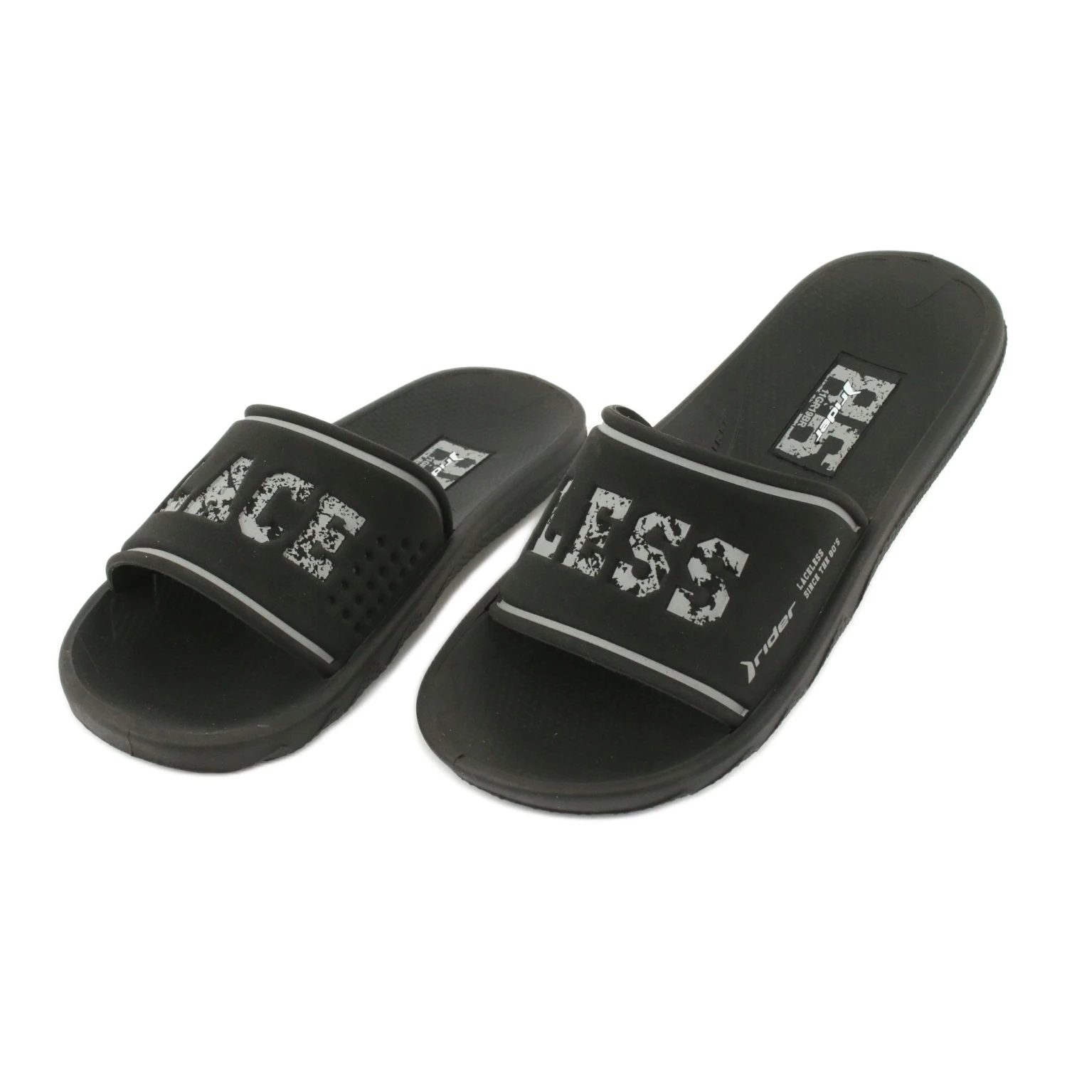 Pantoufles de piscine pour enfants de la marque bien connue et réputée RIDER Montréal IV Kids 82738 dans une nuance de noir intemporelle, une semelle en caoutchouc souple et souple évacue l’humidité de la peau et empêche le pied de glisser à l’intérieur de la tige.