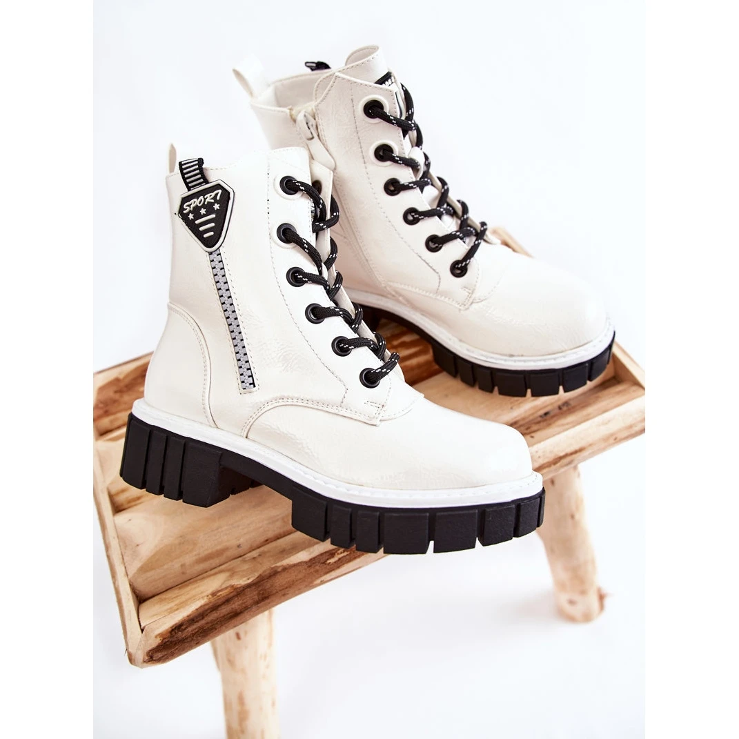 Belles bottes pour enfants en cuir écologique verni. Ils ont un laçage classique et une fermeture éclair. Le modèle est monté sur une semelle délicate et un talon plat avec une bande de roulement. Ces bottes de randonnée ont un talon renforcé. De plus, l’intérieur des bottes est isolé avec une couverture agréable au toucher. Il y a un curseur avec un emblème sur le côté de la tige. Lorsque vous choisissez une taille, veuillez utiliser le tableau des tailles.