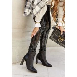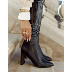 Grandes bottes sur le poste. Ils sont faits de cuir écologique avec une texture de crocodile. Un article stylé au design original. Ne soyez pas surpris et préparez-vous pour les jours plus froids !