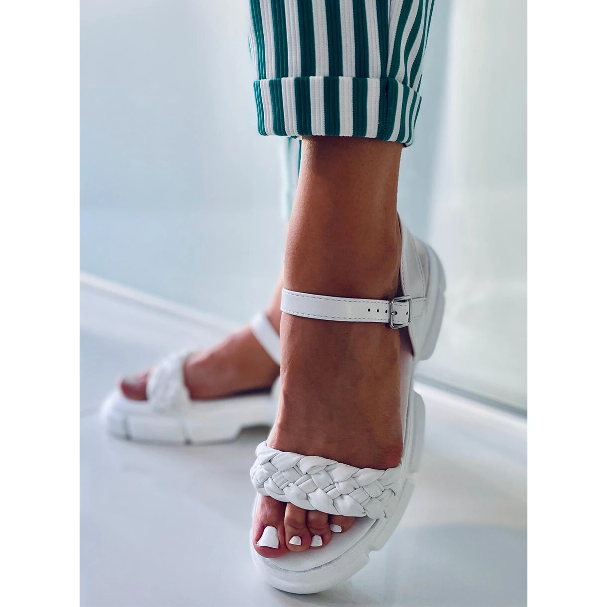 Sandales femme sur semelle haute. C’est un coup de mod à « 10 » ! Une plateforme massive (4 cm) et une ceinture tressée attireront tous les regards… Si vous aimez les chaussures mode et extravagantes, ce modèle est fait pour vous 🙂 Elles sont confectionnées dans un cuir écologique délicat.