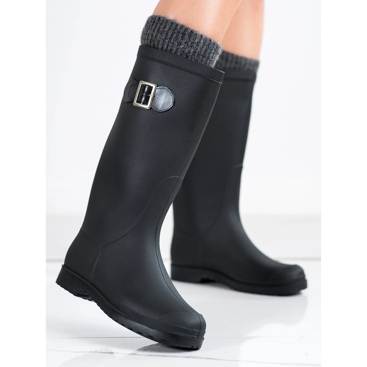 Bottes de pluie pour femmes en caoutchouc imperméable de haute qualité. Les bottes descendent sous le genou et ont une surface noire mate. Les bottes de pluie à enfiler sur le dessus sont ornées d’une petite boucle argentée. La partie inférieure de la tige est un talon de 3 centimètres avec une semelle en plastique rechapée.