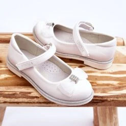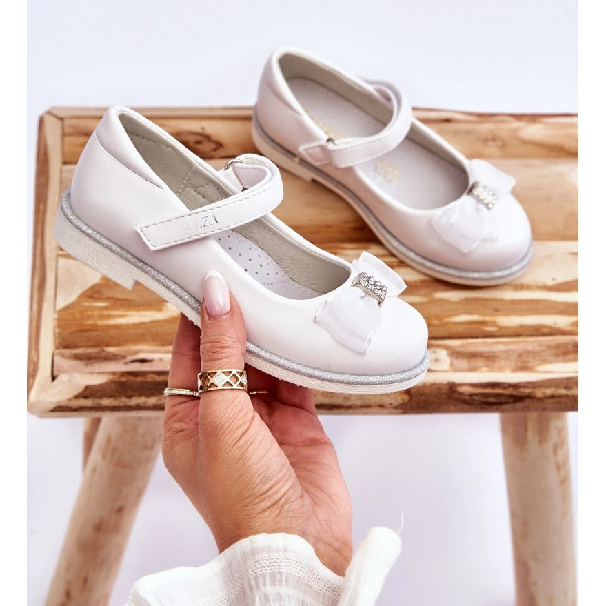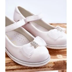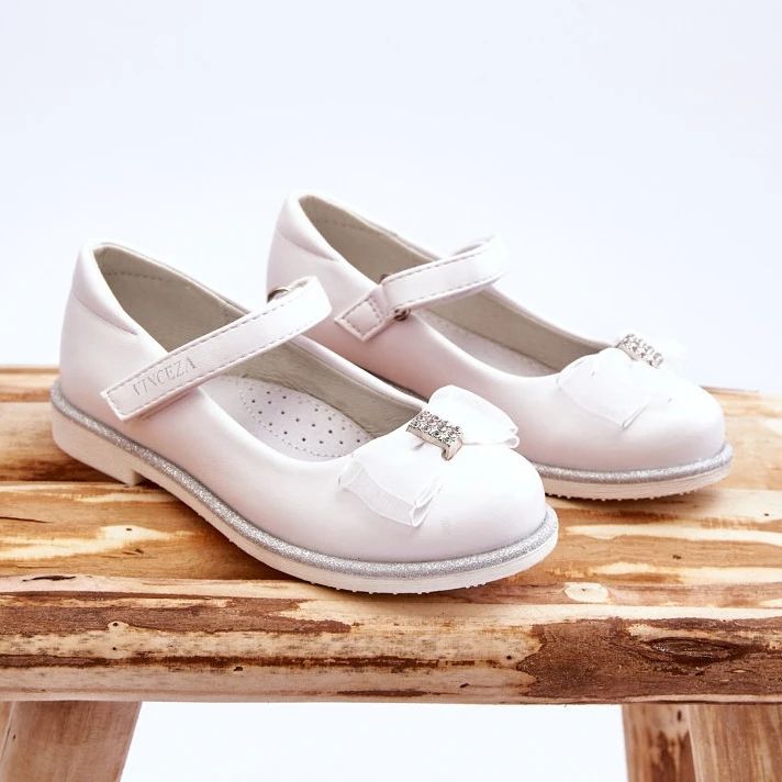 De belles ballerines pour enfants sont en cuir écologique. La semelle intérieure souple et profilée a une perforation délicate et est en cuir naturel. Un nœud en matière avec des décorations en forme de strass est un ajout élégant à ces charmantes ballerines. Le modèle est fixé avec du velcro. La semelle en caoutchouc est décorée de paillettes et est en plus antidérapante. Lorsque vous choisissez une taille, veuillez utiliser le tableau des tailles.