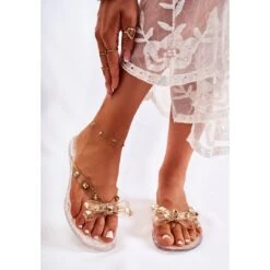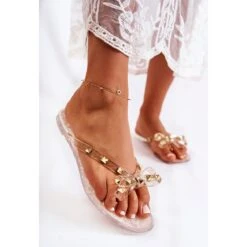 Les tongs uniques sont en caoutchouc. Ils ont des éléments décoratifs sur les rayures sous forme de clous. Il y a un joli nœud sur le devant. L’insert est en plastique. Chaussures montées sur un talon plat. Ce modèle sera parfait pour les journées chaudes ! Vous devez absolument les avoir !