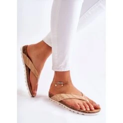 Tongs classiques pour femmes. Fait de matériau en caoutchouc sur le dessus. Les tongs sont montées sur une plateforme en liège, tandis que la semelle est en plastique. Le nez est ouvert, arrondi. Ces tongs sont confortables à utiliser et sont parfaites pour un usage quotidien. Ce modèle devrait être dans votre dressing !