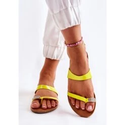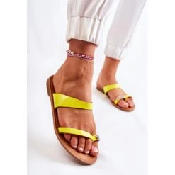 De belles tongs sont faites de cuir écologique verni. Ils ont un emblème décoratif avec des strass sur la bande avant. Montée sur un talon plat avec une semelle antidérapante. Ce modèle est parfait pour les robes en mousseline ou les shorts élégants. N’oubliez pas de consulter également les autres modèles de rabats dans notre magasin !